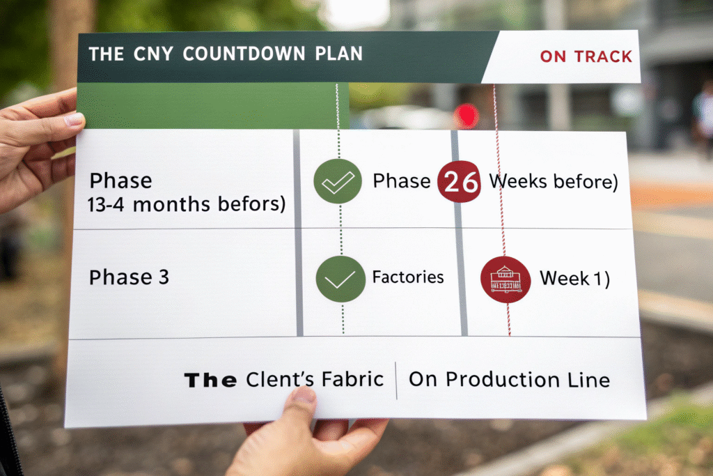 6-8 weeks before CNY, shift from development to execution. This is the critical window for locking in your place on the production schedule.
