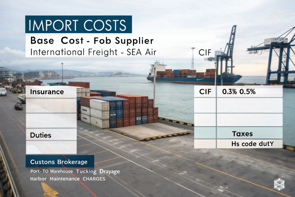Begin with base costs: the FOB price from your supplier. Next, compute international freight expenses by obtaining forwarder quotes for sea and air options. Then, add insurance, typically 0.3%-0.5% of CIF (Cost, Insurance, and Freight) value. Subsequently, calculate duties and taxes by multiplying the customs value (usually CIF) by the HS code duty rate. Finally, incorporate additional fees: customs brokerage, port-to-warehouse trucking (drayage), and harbor maintenance charges.