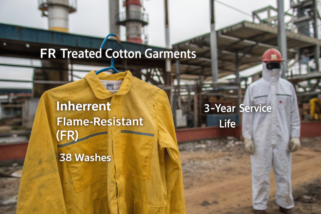 FR-treated cotton uses chemical finishes (typically Pyrovatex or Proban) that create a char-forming barrier on fiber surfaces. These treatments withstand 25-50 industrial washes before protection degrades below NFPA 70E standards. Inherent FR fibers like modacrylic, FR rayon, or aramids have flame resistance built into their polymer structure, maintaining protection through 100+ washes. We documented a chemical plant where treated cotton garments failed compliance after 38 washes, while inherent FR garments remained compliant through their entire 3-year service life.