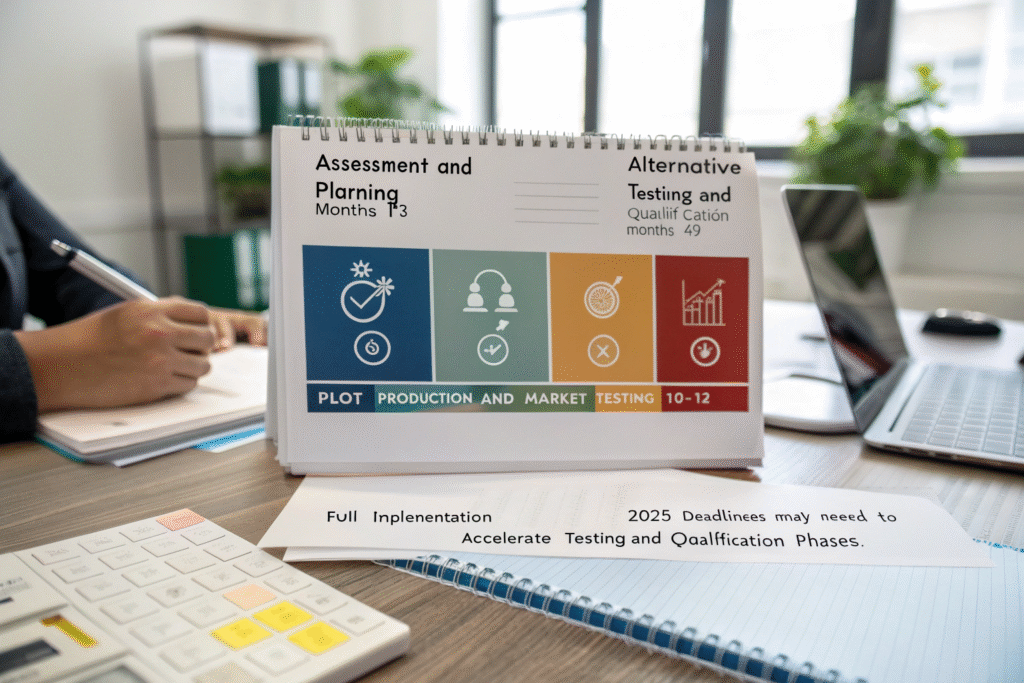 We recommend a four-phase approach over 12-24 months: assessment and planning (months 1-3), alternative testing and qualification (months 4-9), pilot production and market testing (months 10-12), and full implementation (months 13-24). Companies serving markets with 2025 deadlines need accelerated timelines, potentially compressing testing and qualification phases.
