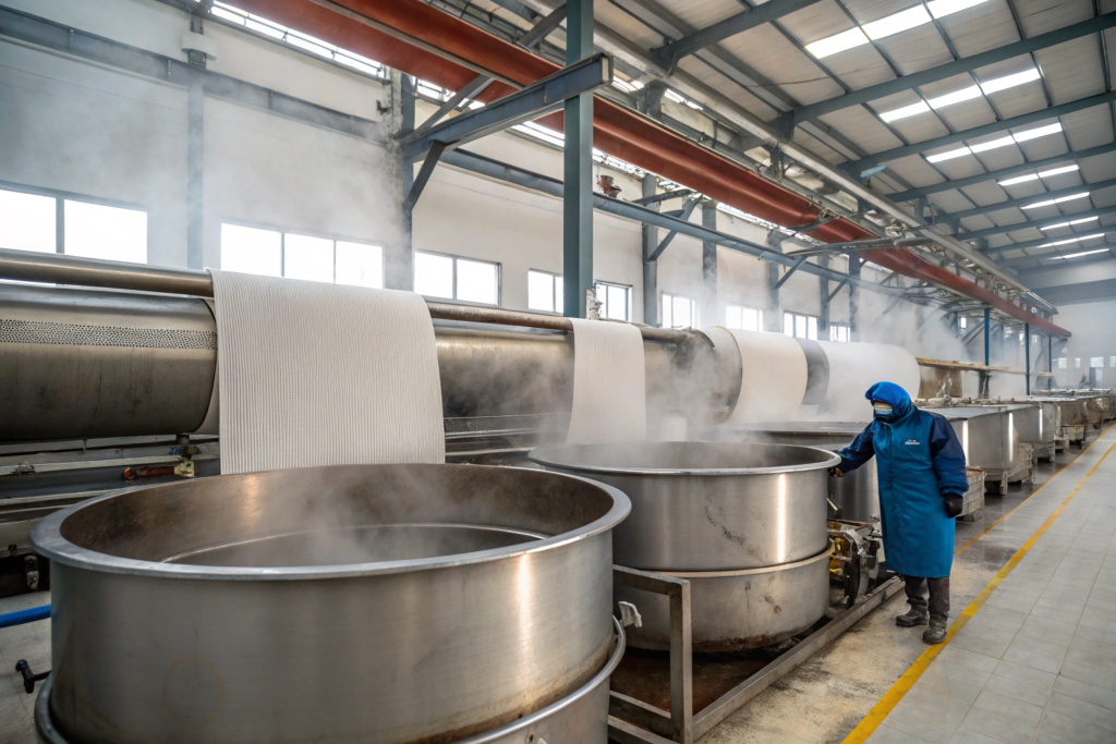 The other massive variable—and this is one most brands never think about—is Residual Chemistry from Previous Lots. A dye machine that just ran a batch of navy blue will leave a tiny, invisible film of blue dye on the stainless steel walls. If the next batch is a pale pink, that pink will be "dirtied" by the blue residue. It's called Cross-Contamination. We combat this with a rigorous Boil-Out Protocol. Between dark and light colors, we run the machine with a strong reducing agent and caustic soda for 45 minutes to strip every last molecule of stray dye. This takes time and costs money in chemicals and water treatment. Many cheap mills skip this step to push through more volume. That's why their light pastels always look muddy. This is the kind of operational discipline you pay for when you work with a supplier who values long-term partnerships over squeezing every last yard out of the machine.