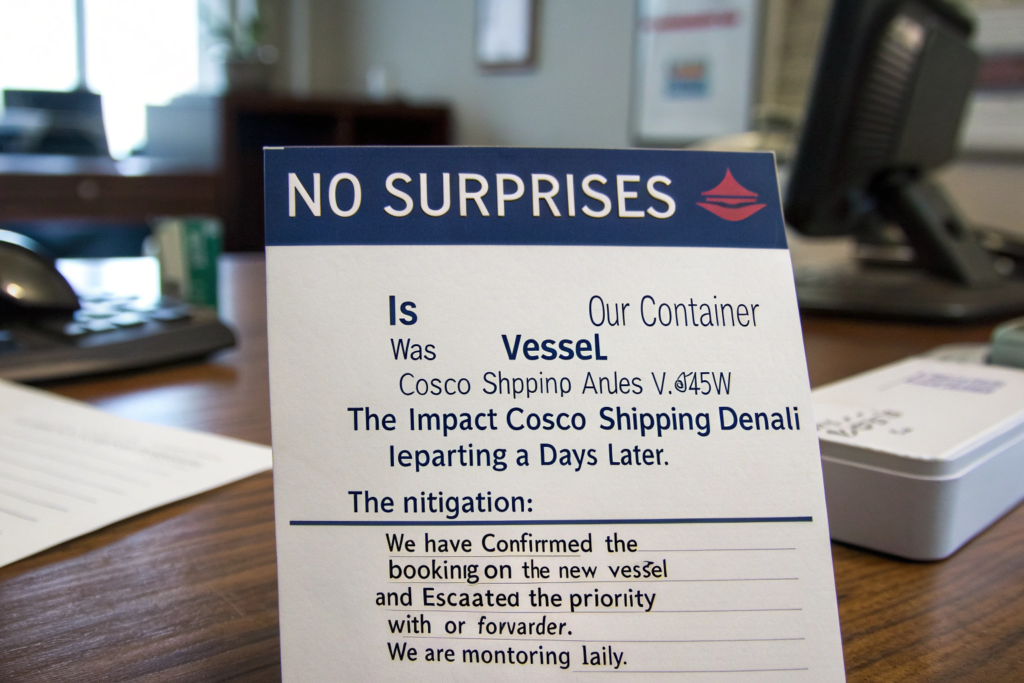 - The Mitigation: "We have confirmed the booking on the new vessel and escalated the priority with our forwarder. We are monitoring daily."