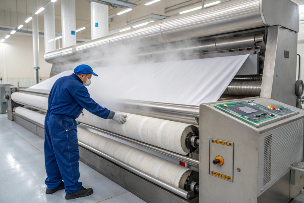 Pre-Conditioning: The fabric is run through a Relaxation Dryer. This is not just to dry it. It is to Normalize the moisture content to exactly 6-8% (for cotton). This ensures the fabric is in equilibrium with the packing environment.