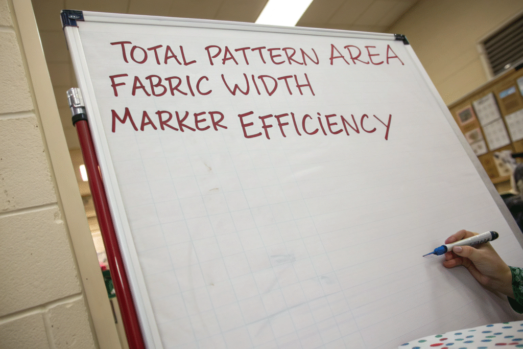 Marker efficiency percentage reflects pattern area utilization against total fabric area. 85% efficiency indicates 15% material waste. Enhancement methods include:
