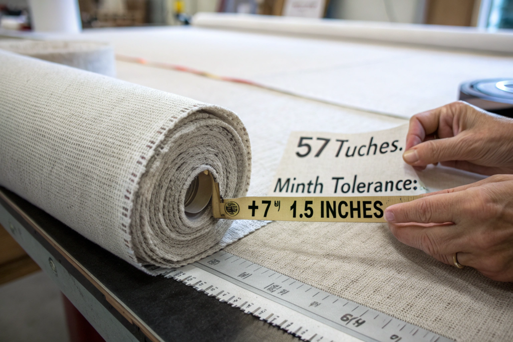 • Woven Fabrics (Cotton, Linen, Wool): Acceptable tolerance is +/- 1.0 inch from the quoted width. If we quote "58/59 inches," a roll measuring 57.25 inches is Acceptable. A roll measuring 56.5 inches is Not Acceptable.
