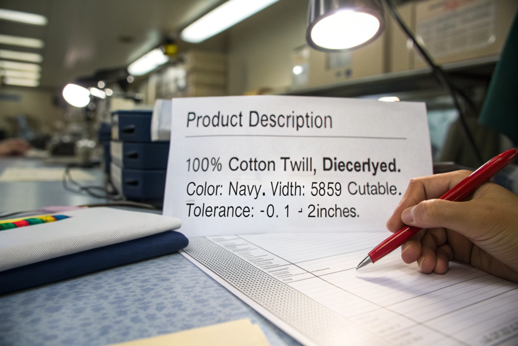 The Purchase Order (PO) is your legal contract. Vague language on the PO is an invitation for the supplier to ship you narrow fabric. You must be Specific and Unambiguous.