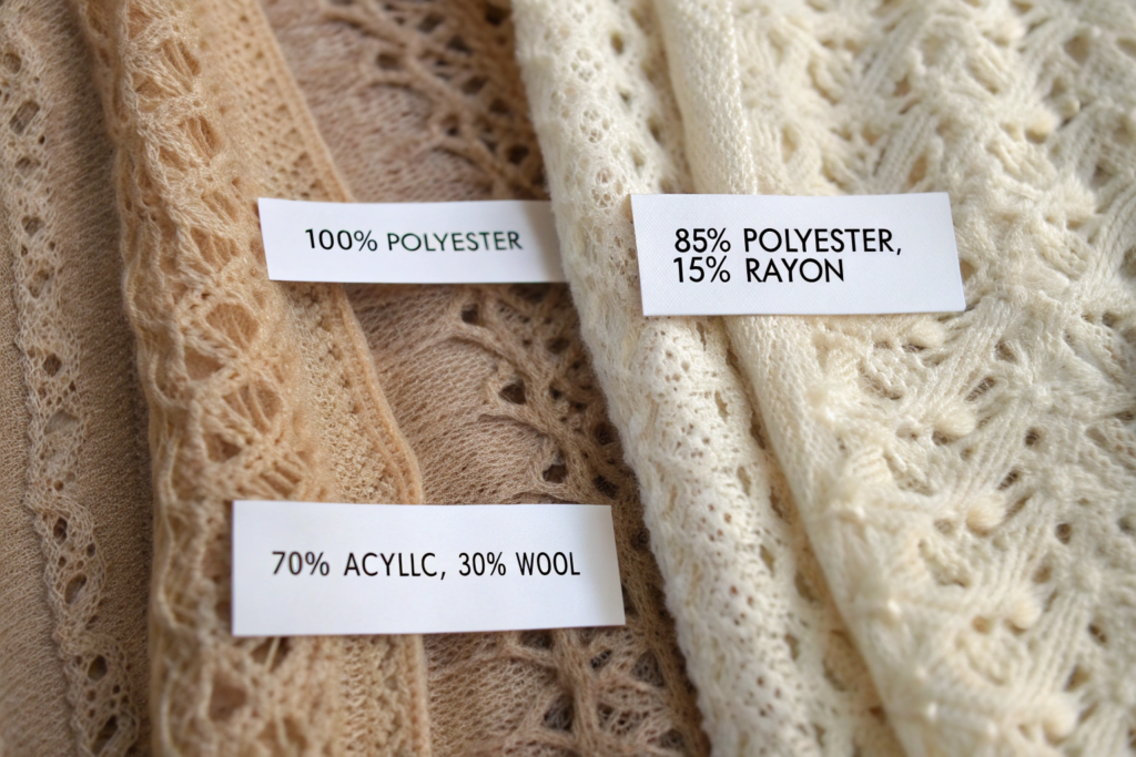 Pure polyester lace can be stiff and plasticky. Pure rayon lace drapes like a dream but can be more expensive and less durable. The Rayon-Polyester blend (common ratios: 70/30, 60/40, or 50/50) is a superstar for budget luxury.