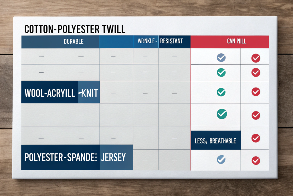 • Cotton-Polyester: The classic workhorse. Cotton adds comfort and breathability; polyester adds strength, reduces shrinkage, and speeds drying. A 50/50 blend is common for uniforms and bed linens for its balance.