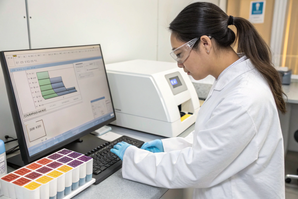A spectrophotometer measures color the way a ruler measures length. It quantifies color across the visible spectrum and gives us numbers—specifically, Lab values. L is lightness to darkness. a is green to red. b is blue to yellow. If I give my dyeing team a target with specific Lab* numbers, they can formulate a dye recipe to hit that target mathematically. And when the next batch comes through, we measure it against the same numbers. No guessing. No "is this close enough?" arguments.