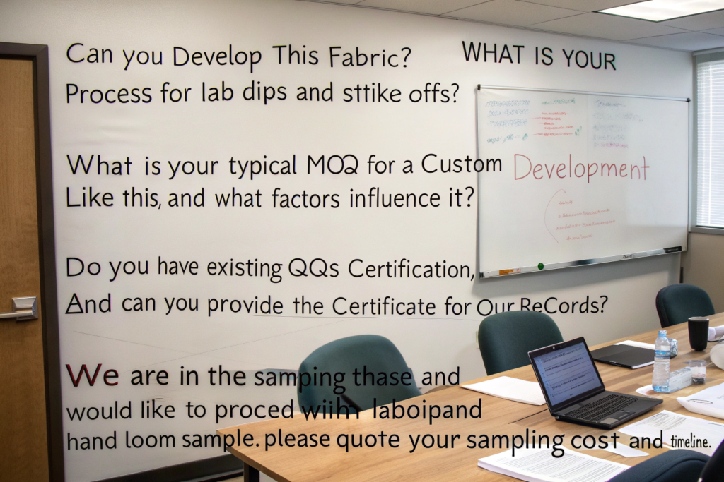 - State Your Next Step: "We are in the sampling phase and would like to proceed with a lab dip and hand loom sample. Please quote your sampling cost and timeline."