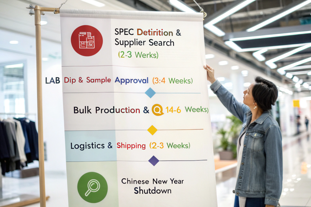 Forget "fast fashion" speed when developing custom denim. Quality fabric sourcing is a marathon, not a sprint. A typical timeline from initial contact to fabric on a ship is 10-14 weeks for a custom development, and 4-6 weeks for a stock fabric order. This timeline is heavily influenced by two major factors: Chinese public holidays (plan for a complete 3-4 week shutdown around Chinese New Year) and industry peak production seasons (March-May and August-October), which can add 1-2 weeks of lead time.