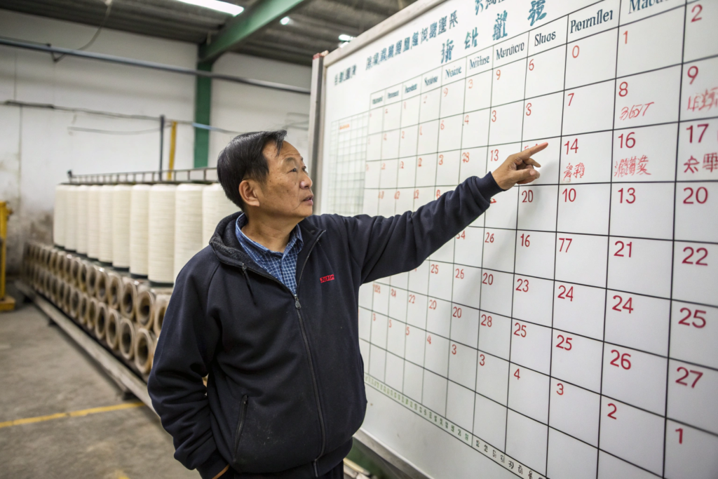 She will connect you with our technical knit team. We will pull the yarn cones. We will run the moisture management tests. We will build the timeline that accounts for the peak season backlog and the CNY shutdown.