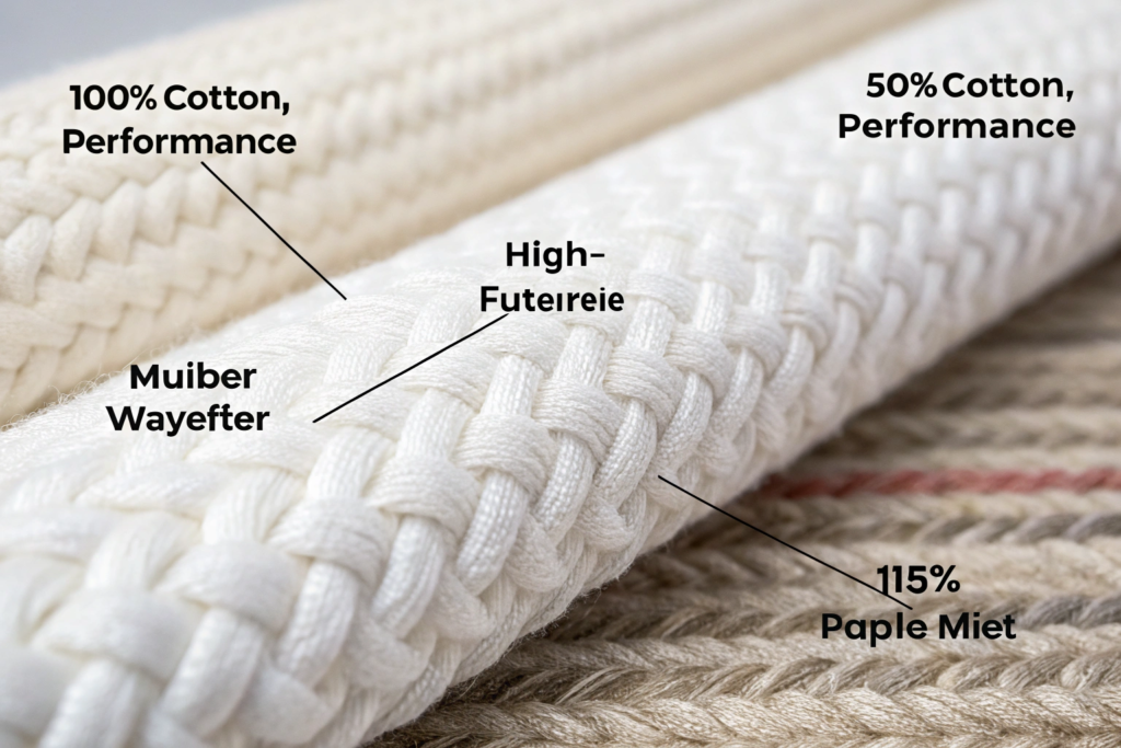 A 50/50 or 60/40 cotton-polyester blend is the workhorse of the hospitality industry. The cotton gives you the natural look and feel. The polyester adds durability and wrinkle resistance. It also helps with stain release because polyester doesn't absorb stains the way cotton does.