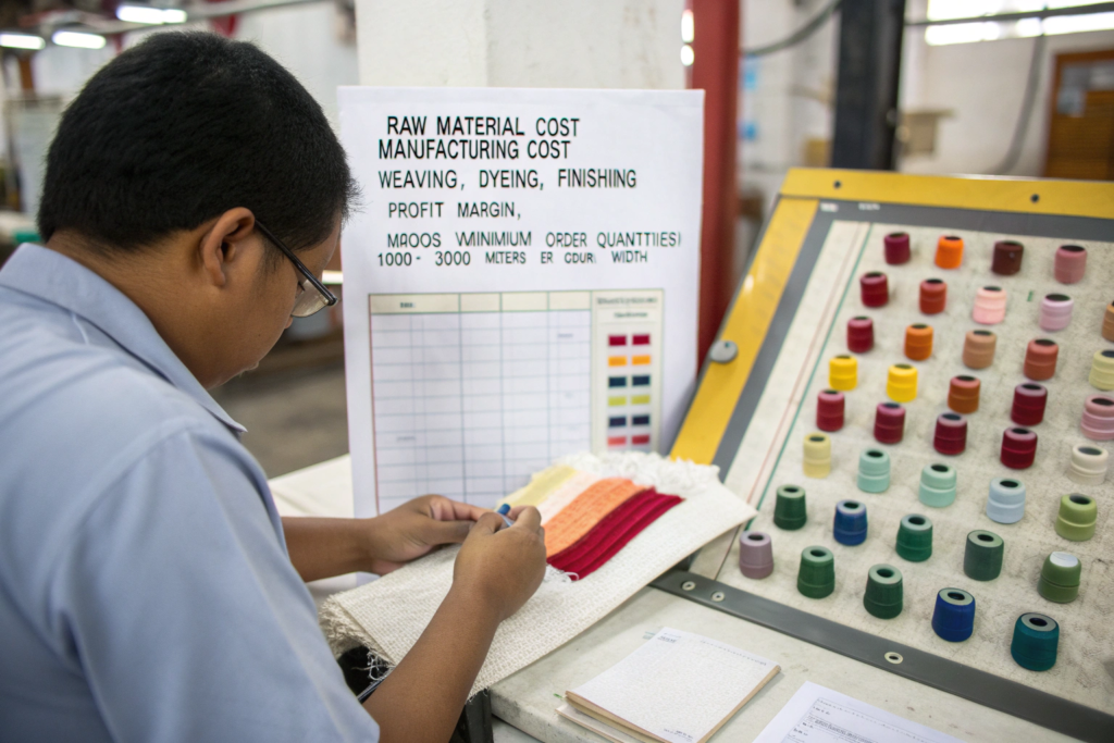 The sampling process should be methodical: Lab Dip (color approval on small yarn swatches) -> Handloom Sample (small fabric piece to approve construction/feel) -> Bulk Production Sample (from the actual production line, for final confirmation). For costing, understand the breakdown: raw material cost + manufacturing cost (weaving, dyeing, finishing) + profit margin + logistics. MOQs (Minimum Order Quantities) are the biggest hurdle for startups. A typical MOQ for a custom fabric can be 1000-3000 meters per color/width.
