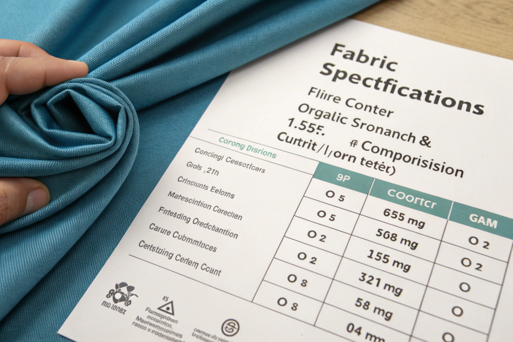 Your fabric specifications should cover five core areas: Fiber Content & Composition (e.g., 95% Organic Cotton, 5% Spandex), Fabric Construction (e.g., 2x2 Rib Knit, 180GSM), Width (in cm or inches), Key Performance Parameters (like weight/GSM, stretch percentage, pilling resistance), and Finish & Certifications (e.g., enzyme wash, GOTS certified). Don't forget the hand feel—this subjective quality is crucial. Bring a physical sample of a fabric you love as a reference point. This is your single most powerful communication tool.