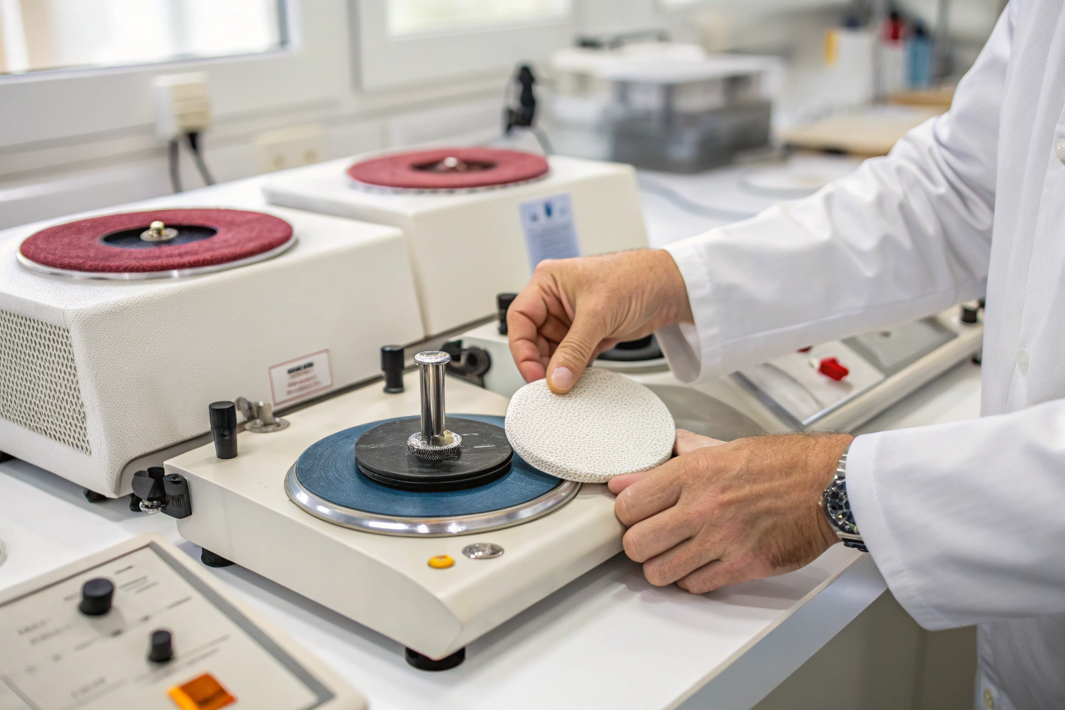 The Martindale test is the industry standard for woven and knitted fabrics. We use it in our CNAS-accredited lab for almost every knit order. Here's how it works. We cut a circular sample of your fabric and mount it on a testing station. Then we rub it against a standard abrasive fabric in a figure-eight motion. After a set number of cycles—usually 2,000, 5,000, or 7,000—we visually compare the sample to a set of standard photos. The fabric gets a rating from 1 to 5.