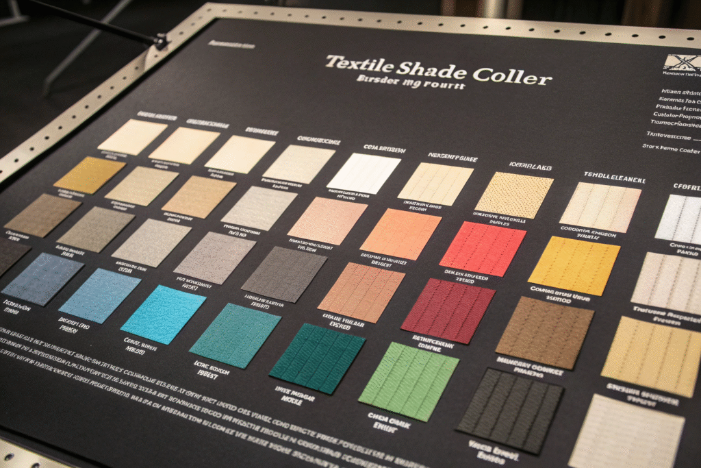 A proper shade band system includes the target shade (Pantone match) plus multiple lighter and darker variations that represent your upper and lower tolerance limits. During production, we continuously compare running fabric against these bands to ensure consistency and catch drift before it becomes unacceptable.