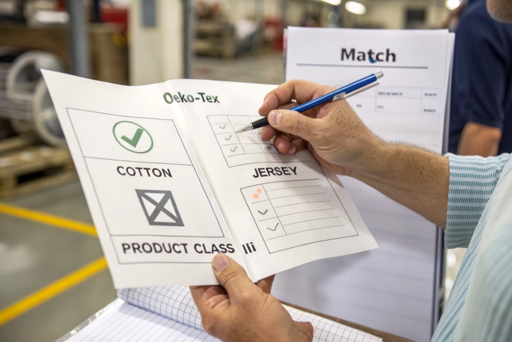 Find the section that lists the certified articles. It should describe the fabric composition, construction, and importantly, the Product Class (I, II, III, or IV). Your order must fall within this described scope. For example, if you are ordering "100% Cotton Jersey, dyed, for T-shirts," the certificate should list an article that closely matches this description. A mismatch, like the certificate being for "100% Polyester Twill," means your product is not certified.