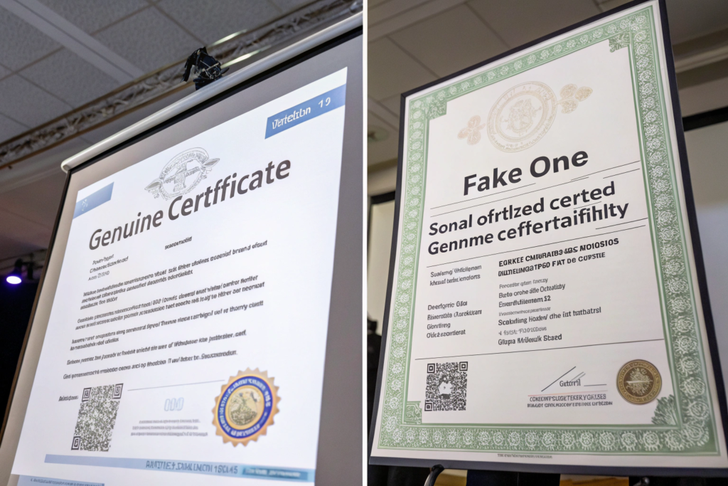 Certificates that look "off" in quality. Blurry text, wrong colors, inconsistent fonts, or obviously photoshopped elements should trigger immediate suspicion. Compare to known genuine certificates from the same issuer.