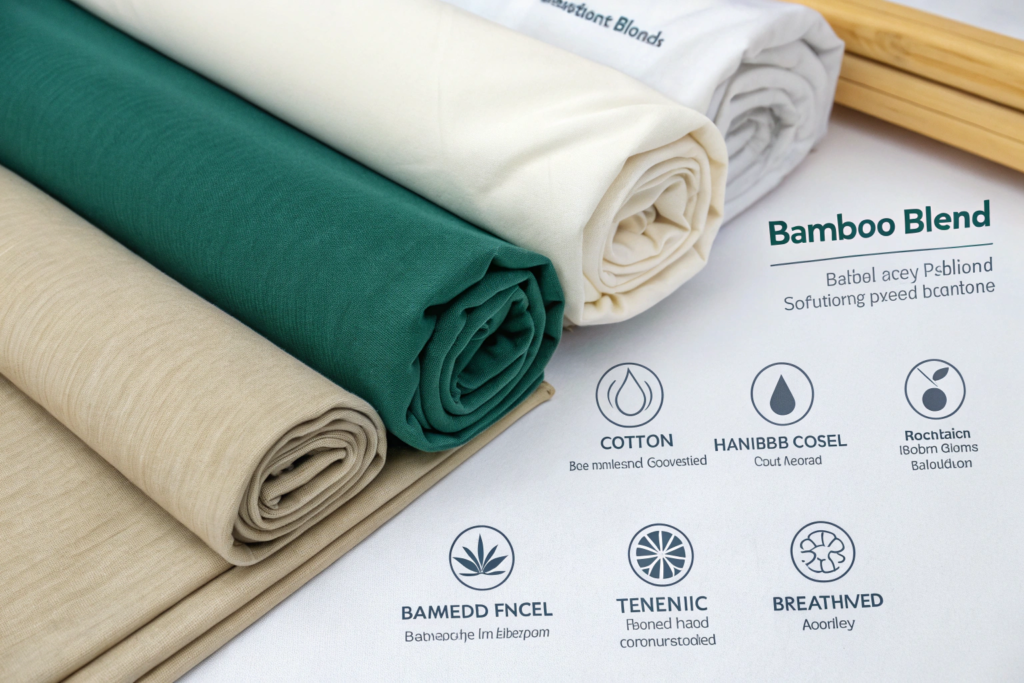 Bamboo-polyester blends add durability and wrinkle resistance. The polyester component improves recovery, reduces wrinkling, and extends garment life. For active summer wear or travel garments, 60% bamboo, 40% recycled polyester creates a fabric that feels natural but performs like a technical fabric. A California activewear brand uses this blend for their summer hiking collection and reports excellent customer satisfaction.