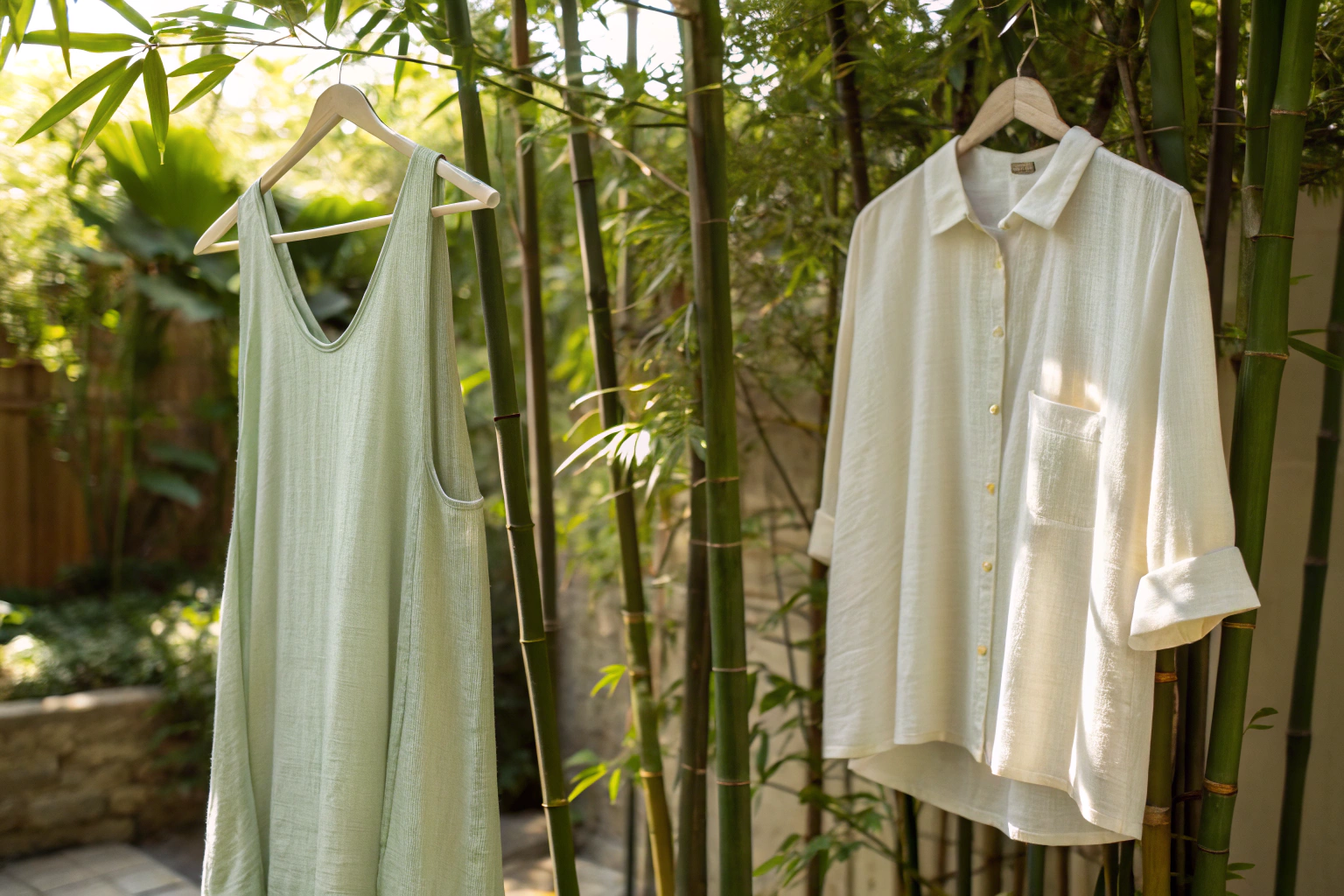 Summer trousers and skirts benefit from bamboo's breathability and drape. Wide-leg trousers in bamboo crepe or twill move beautifully while keeping the wearer cool. The fabric doesn't cling in humidity, a major advantage over synthetic alternatives. A Dutch sustainable brand reports their bamboo trousers are the best-selling item in their summer collection, with customers consistently praising comfort.