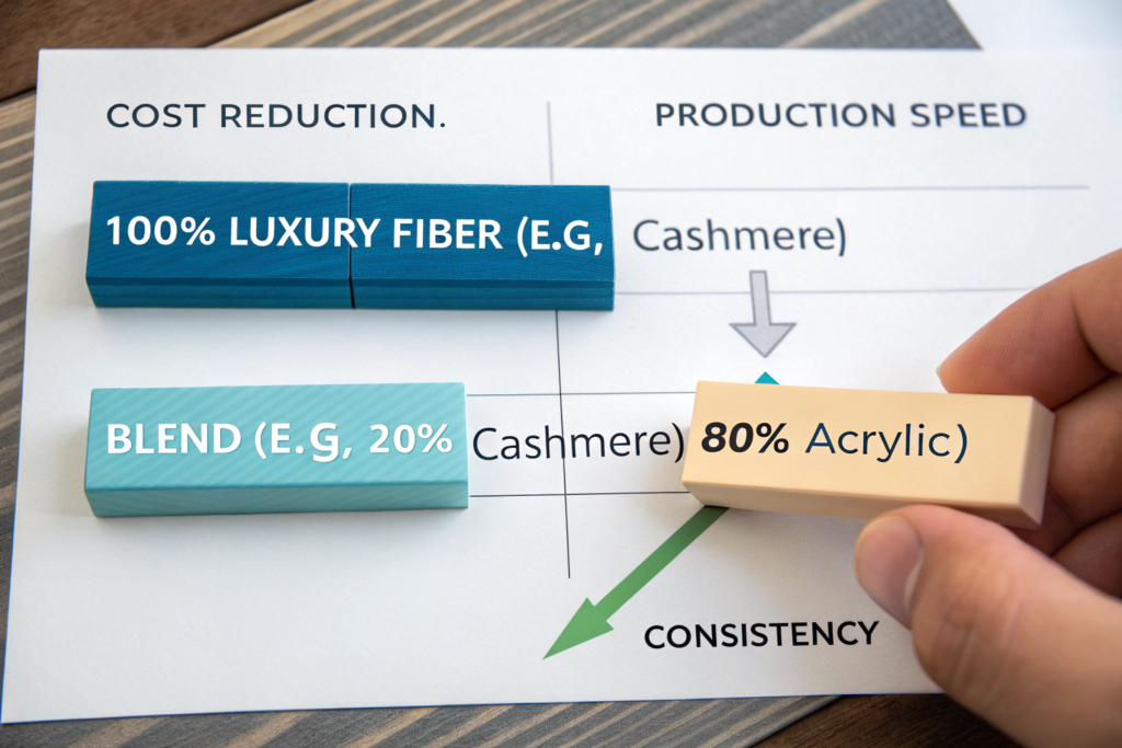 • Premium Fiber Extension: Adding 20-30% of a luxury fiber like cashmere, silk, or merino wool to a base of cotton, acrylic, or polyester creates a fabric that carries the premium feel and marketing story at a fraction of the cost of a 100% luxury item. A 55% Cotton / 35% Polyester / 10% Cashmere sweater feels luxuriously soft but is far more affordable and durable than a pure cashmere one.