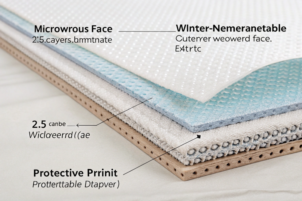 3-layer: Face fabric + membrane + knitted or woven backer. All layers are permanently laminated. Most durable, best next-to-skin feel, highest cost. Used for alpine and professional use. Typical weight: 120-200 g/m².