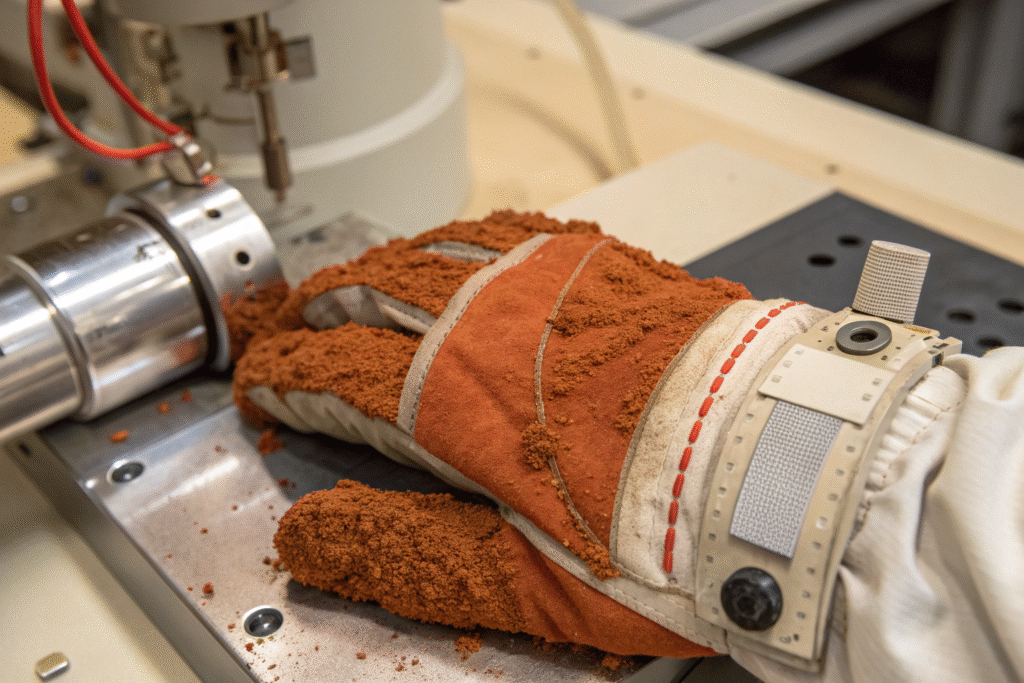The microstructure of Martian regolith makes it significantly harsher than any desert dust on Earth. Its angular grains penetrate between yarns and accelerate wear. Testing with simulants has shown that fabrics without specialized resistance lose tensile strength in days rather than months.