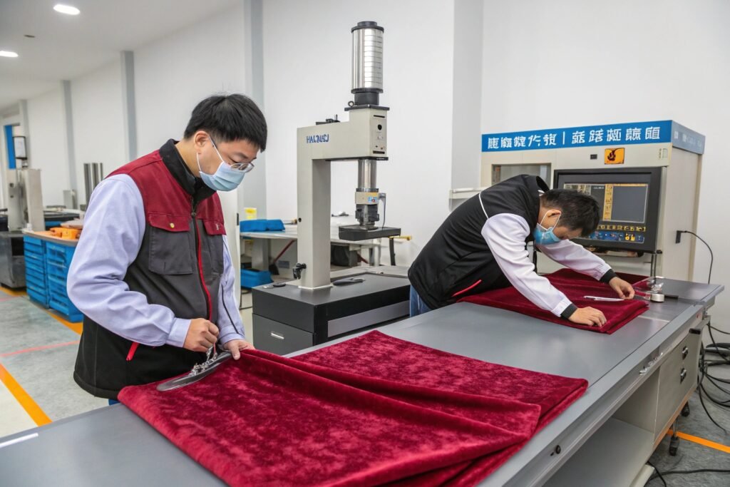 You can measure fabric stretch by pulling it 5 inches wide and noting how far it extends before distorting. A good adaptive velvet should stretch to 7–8 inches and recover without curling or bagging. Some buyers use ASTM D2594 for industry-standard stretch testing.