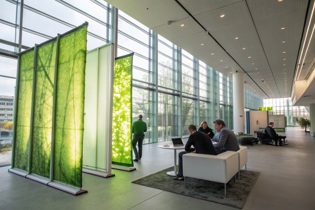 Living textiles can indeed become part of architectural design. Interior designers and architects are experimenting with algae panels that function as both decoration and natural air purifiers. Similar to green walls, they bring life into spaces but with a lighter footprint. For example, ecoLogicStudio has created algae curtains that filter air while also producing biomass. Another case is Dezeen’s feature on algae architecture, showing how fashion and construction can merge through biotechnology. In Milan, a shopping mall trialed algae textile walls and reported not only improved air quality but also increased customer curiosity, enhancing the brand’s sustainability image.