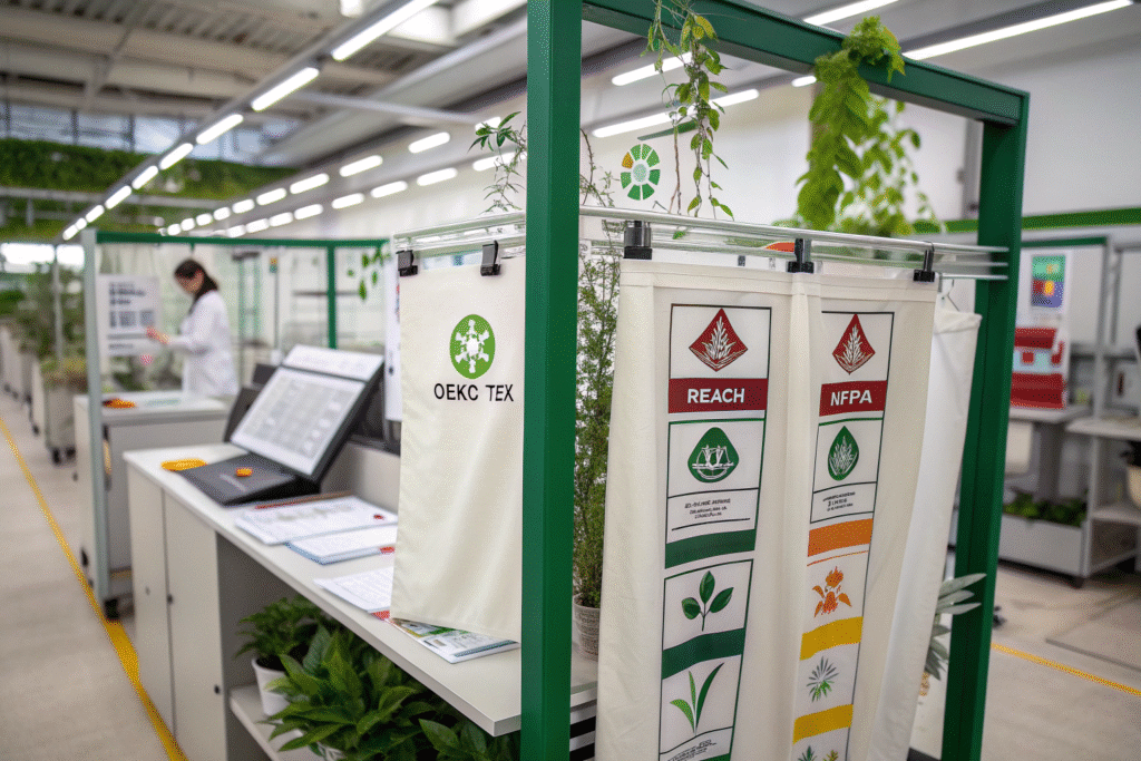 Check specific NFPA textile codes or OEKO-TEX certification tools.