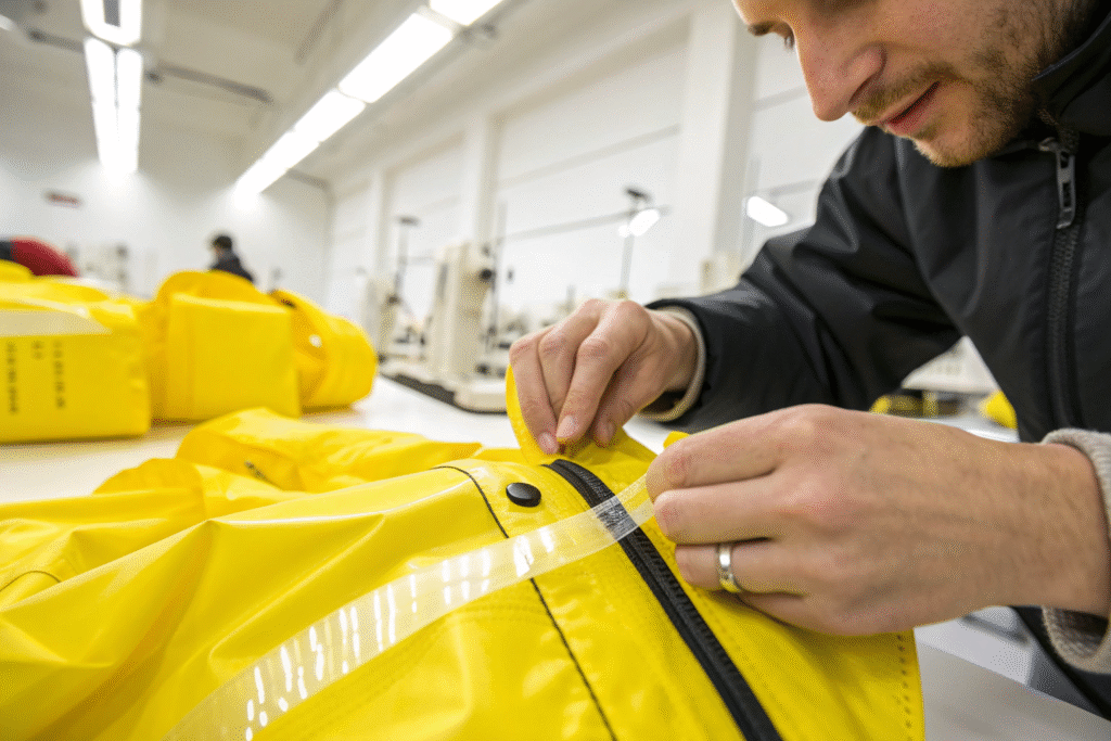 Seam tape prevents water leakage by forming a continuous waterproof layer over the sewing lines. The tape material is made from a plastic film that becomes sticky when heated. Using specialized heating equipment, we apply this tape with exact temperature and pressure control. The melted adhesive material flows into the needle holes, sealing them completely. The quality of application is vital; uneven application or wrinkles can create weak spots. We work with manufacturing partners who use advanced automated tape application equipment to achieve consistent, reliable results on every garment.