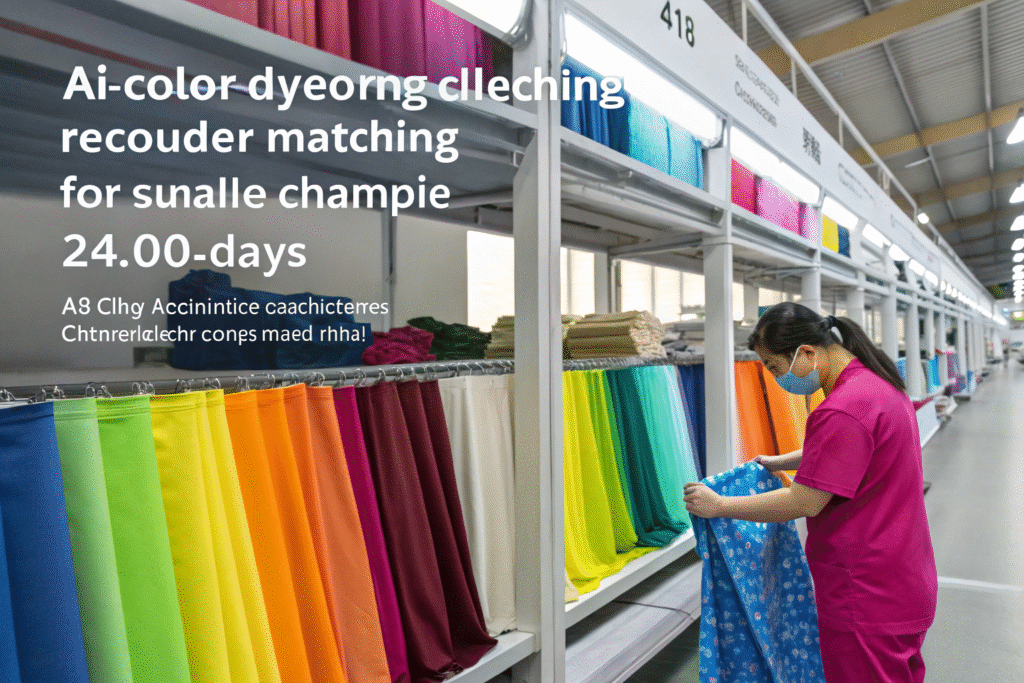 Local dyeing and AI color matching cut sample time to 2 days. We stock 4,000+ chlorine-resistant colors in Keqiao.