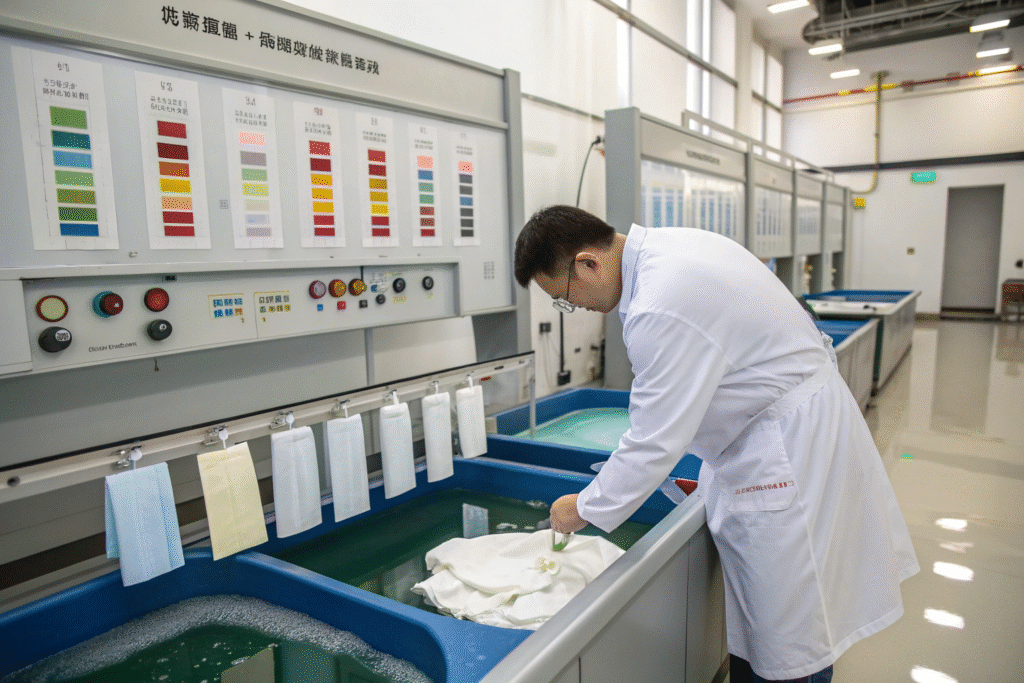 AATCC 162 and ISO 105-E03 tests measure real chlorine damage. We run both in our CNAS lab. Fabrics must survive 240 hours with less than 10% strength loss.