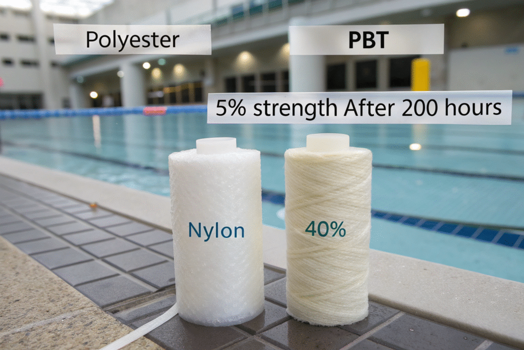 Polyester and PBT fibers lead in chlorine resistance. Tests show polyester loses only 5% strength after 200 hours in pool water. Nylon loses 40%.