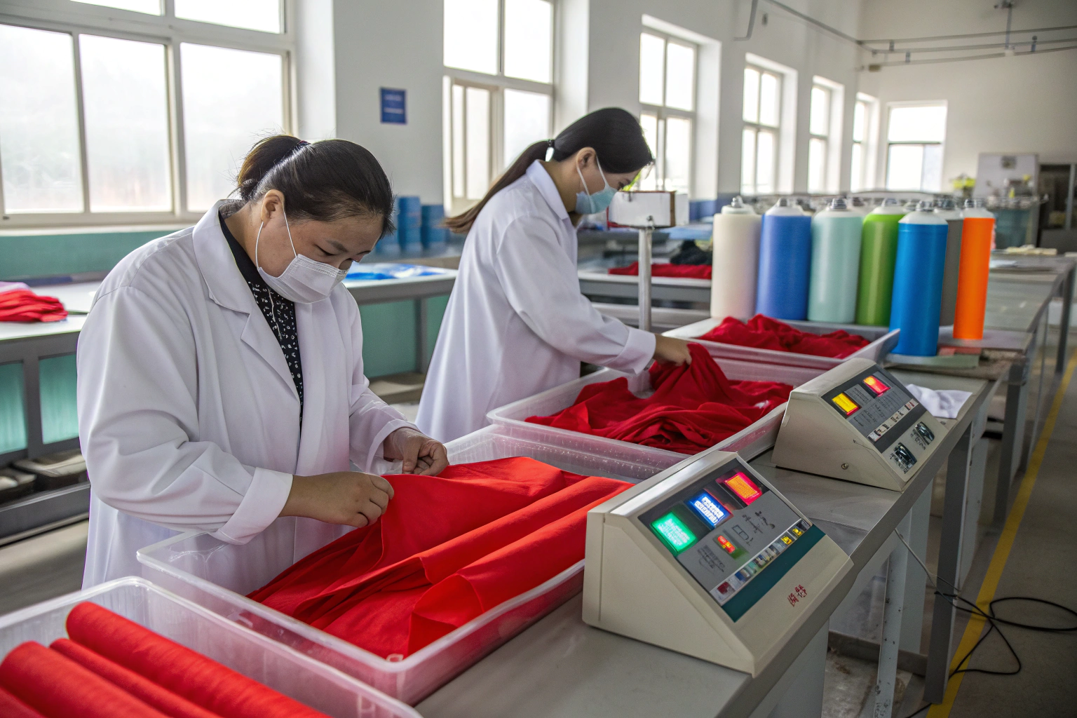 We keep pre-dyed polyester yarns. No waiting for dye lots. Our AI system matches Pantone in 0.3 delta E. First sample is usually perfect.