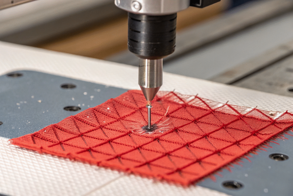 The reinforced grid is created during weaving by programming the loom to interlace thicker threads at regular intervals. These stronger threads act as a built-in safety net, absorbing and distributing stress to prevent localized damage from spreading.