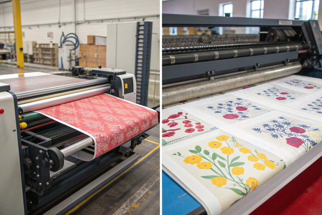 The core distinction begins with the machinery. Rotary systems feature metal cylinders that rotate continuously as fabric moves beneath them. Flatbed systems use stationary screens that lift and lower while the fabric advances intermittently.