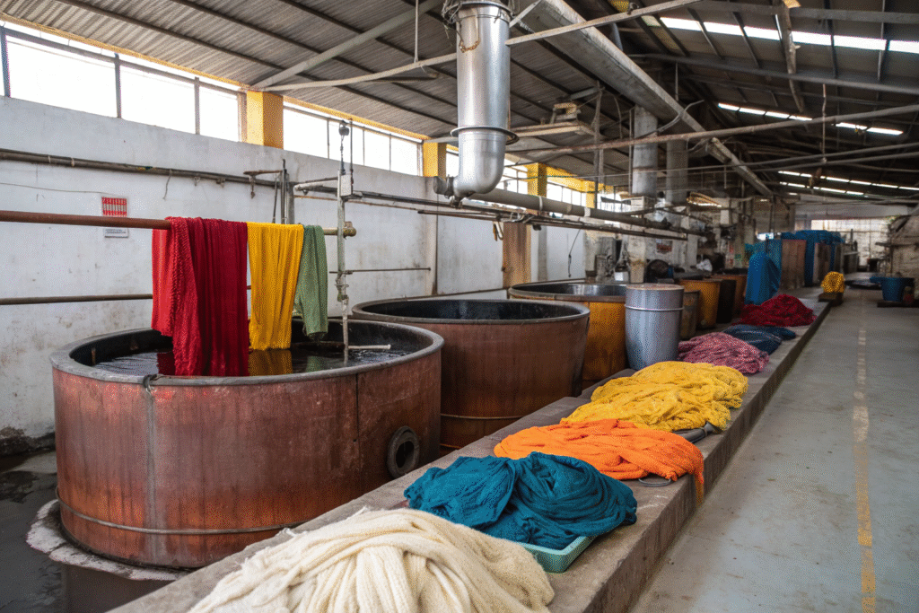 Piece-dye soaks fabric post-weave. A Texas polo brand dyed 5000m cotton—used 150 tons water, effluent dark.
