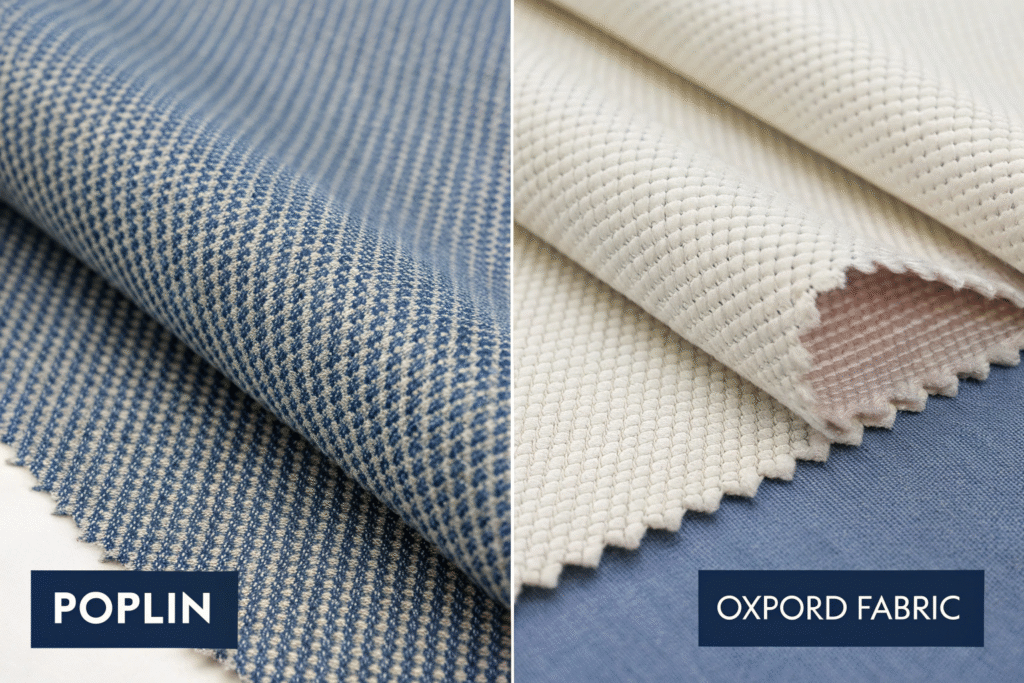 Poplin emphasizes formality and smoothness, while oxford highlights durability and texture.