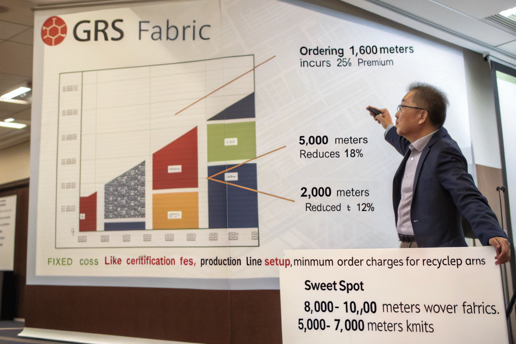 The relationship between volume and cost isn't linear—it's stepped. Ordering 1,000 meters of GRS fabric might carry a 25% premium, while 5,000 meters could reduce that to 18%, and 20,000 meters might bring it down to just 12%. This happens because fixed costs like certification fees, production line setup, and minimum order charges for recycled yarns are spread across more units. The "sweet spot" for GRS pricing typically starts around 8,000-10,000 meters for woven fabrics and 5,000-7,000 meters for knits.