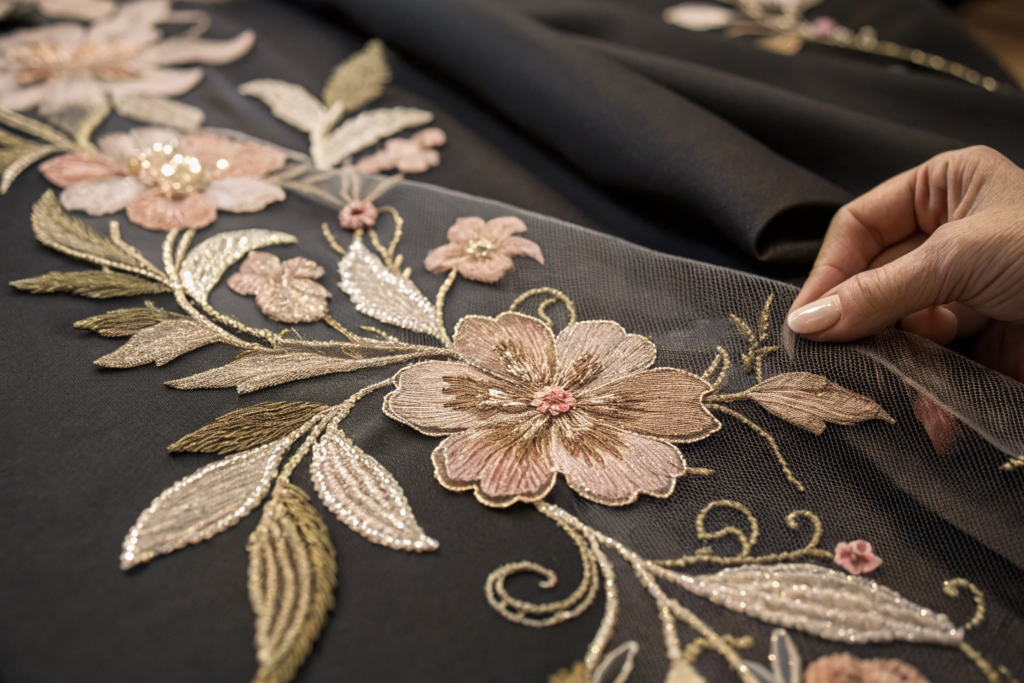 • Choose Embroidery if: You want bold texture, structural embellishment, or are applying lace as an accent on a heavier fabric (eveningwear bodices, overlay on gown skirts, structured jackets).