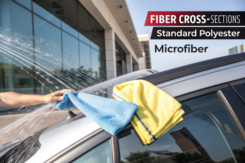 This is where microfiber has no competition. A standard polyester cloth will push dirt and water around. A microfiber cloth will trap it. The difference is structural.