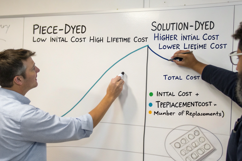 The upfront cost per meter of solution-dyed fabric is often higher. But true cost is measured per year of service, not per meter. You must calculate total cost of ownership (TCO), which includes replacement costs, customer dissatisfaction, and brand reputation damage from failing products.