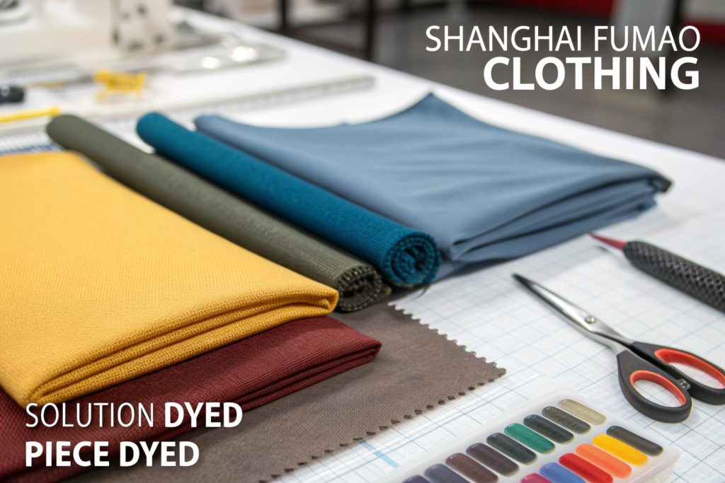 The key differences are in colorfastness, cost, and flexibility. Solution-dyed fabrics offer superior colorfastness to light, washing, and chemicals. They are the most durable option. However, they are more expensive and require you to commit to a color early in the process. Piece-dyed fabrics are less expensive and offer maximum flexibility in color choices, but the color is less durable. It is more likely to fade in the sun or crock (rub off) over time. At Shanghai Fumao Clothing, we help our clients choose the right method based on how the final accessory will be used.