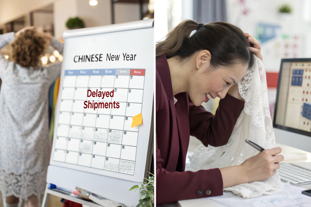 Chinese New Year (CNY) is the most significant disruption. A European fashion brand we work with now has this down to a science: they complete all pre-production (final lab dips, approved strike-offs, and lace embellishment approvals) a full 6 weeks before the holiday. This ensures their production order is first in line when factories reopen. Here's a sample critical path for a Spring/Summer lace collection needing a CNY shipment: