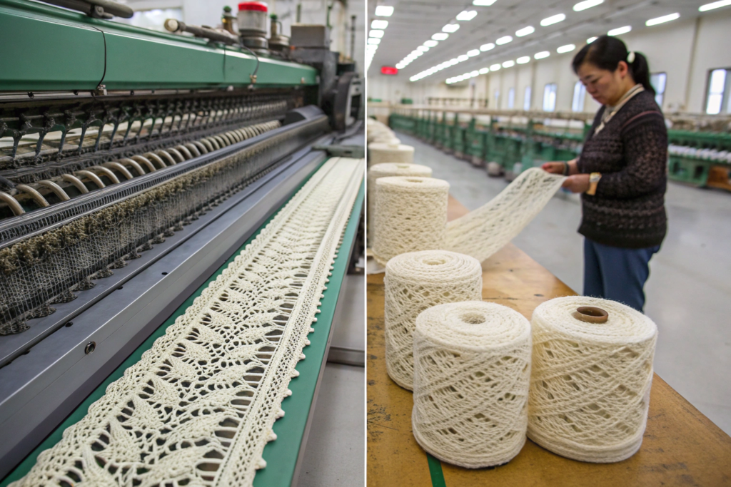 You must analyze both variables together. Leavers lace (a type of warp-bobbin lace) tends to have a firmer, more defined hand due to its tight twist and dense ground. Raschel knitted lace, on the other hand, has more inherent stretch and a softer, often limier hand. The same fiber will behave differently in these two machines.