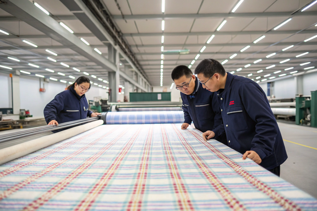 We solve this in two ways. First, we keep what we call a “golden sample” of every custom fabric we produce. It’s a physical piece of fabric with the exact color and finish that was approved. When we run a new batch, we match against this golden sample, not against a digital file or a memory.