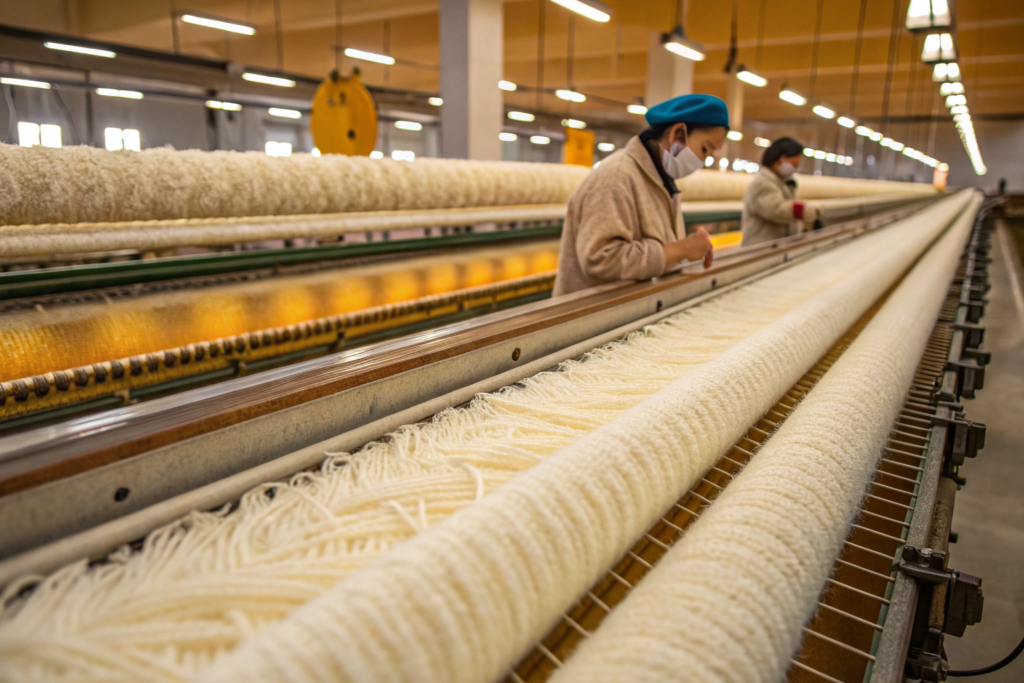 Steaming: Relaxes fibers and sets the final hand feel.