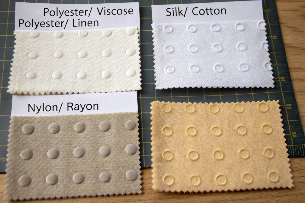 Nylon base with rayon pile: Nylon is also acid-resistant. Rayon dissolves. This combination gives good stretch if needed. We used this for a sportswear-inspired evening wear collection for a German designer. Unusual, but it worked.